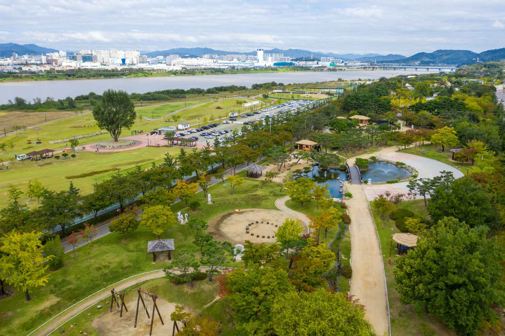 구미 시민들의 대표적인 여가 공간인 동락공원은 다양한 운동시설과 쉼터를 갖추고 있습니다. 특히 벚꽃 시즌에는 분홍빛 꽃길이 펼쳐져 많은 사람들이 찾는 곳이에요. 강변을 따라 조성된 산책로와 자전거 도로도 매력적입니다.