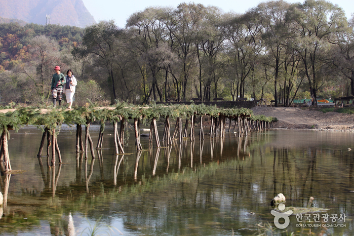 전통 나무다리를 복원한 섶다리 마을은 동강을 따라 이어지는 평화로운 풍경이 인상적입니다. 나무, 짚, 나뭇가지로만 만든 다리를 건너며 옛 사람들의 지혜를 느낄 수 있고, 주변 풍경과 어우러져 특별한 여운을 남겨요. 봄과 가을엔 특히 많은 사진 작가들이 찾는 인기 촬영지이기도 하답니다.