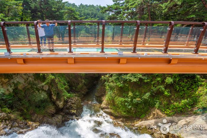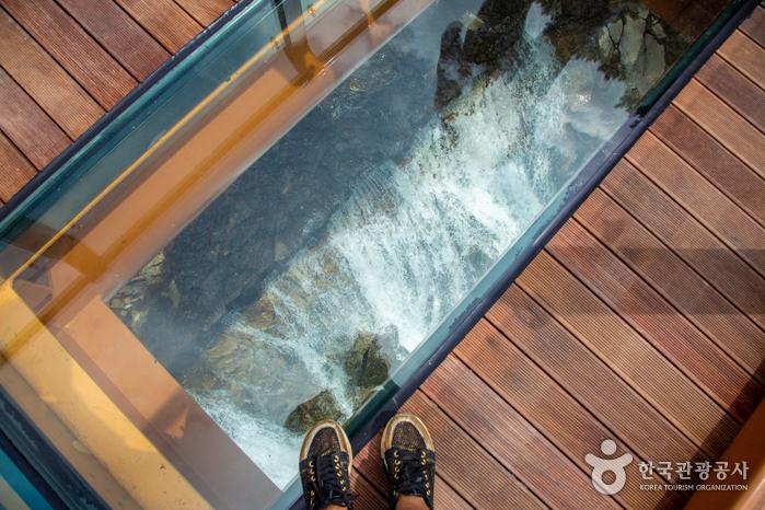 높이 약 30m의 절벽 위에 설치된 유리전망대에서 아래로 쏟아지는 용추폭포를 아찔하게 내려다볼 수 있는 명소입니다. 주변 자연과 어우러진 스릴 있는 풍경 덕분에 스카이워크를 즐기듯 색다른 체험이 가능한 포토스팟으로 떠오르고 있어요.