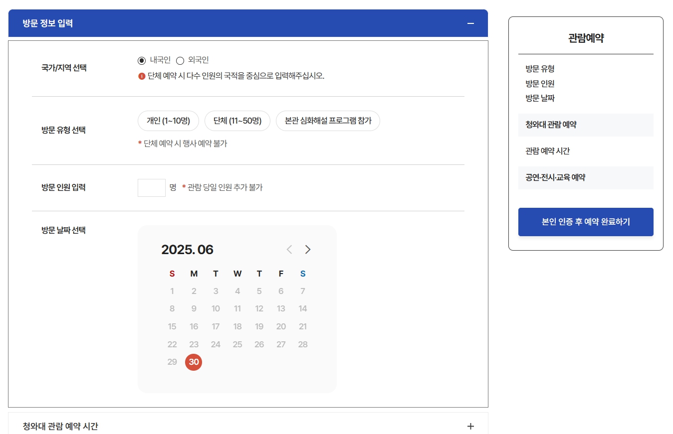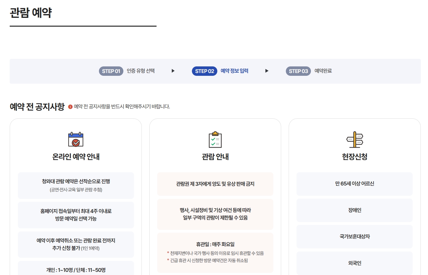 - 예약처: 청와대 국민개방 누리집